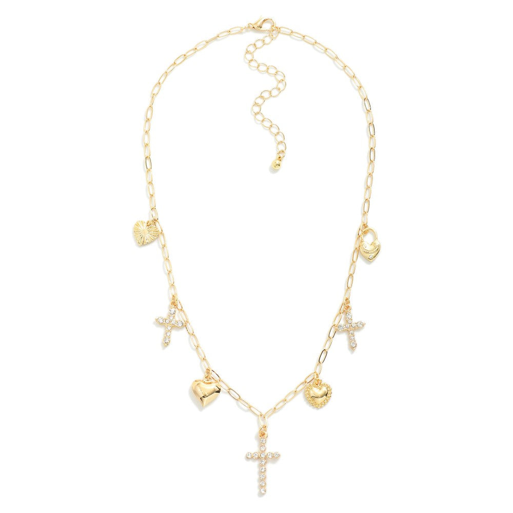 Gold Tone Chain Link Necklace Featuring Cross And Heart Charms