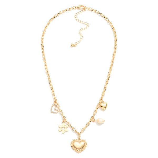 Chain Link Charm Necklace Featuring Metal Tone Hearts, Rhinestones, & Pearl Charms