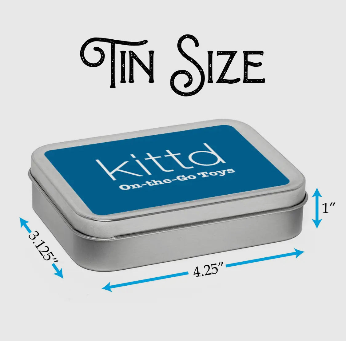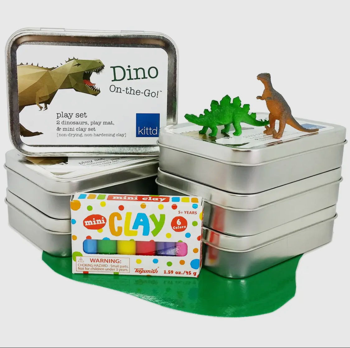 Includes: Travel tin (4 1/4" x 3 1/8" x 1"), play mat (7”), 2 dinosaurs (will vary), set of mini clay. Ages 5+. Small Parts.