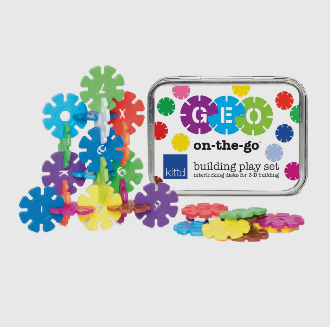 3-D building on the go! Create colorful geometric sculptures no matter where you are. Great for restaurants, car trips, waiting rooms, and siblings’ events - anywhere kids need to wait and parents want them off electronics. Building disks grow with kids, working their fine motor skills, spatial awareness, and planning skills without them even realizing it! Kids’ creations can be as big as their imaginations, but they’ll still pack back up in the tin!