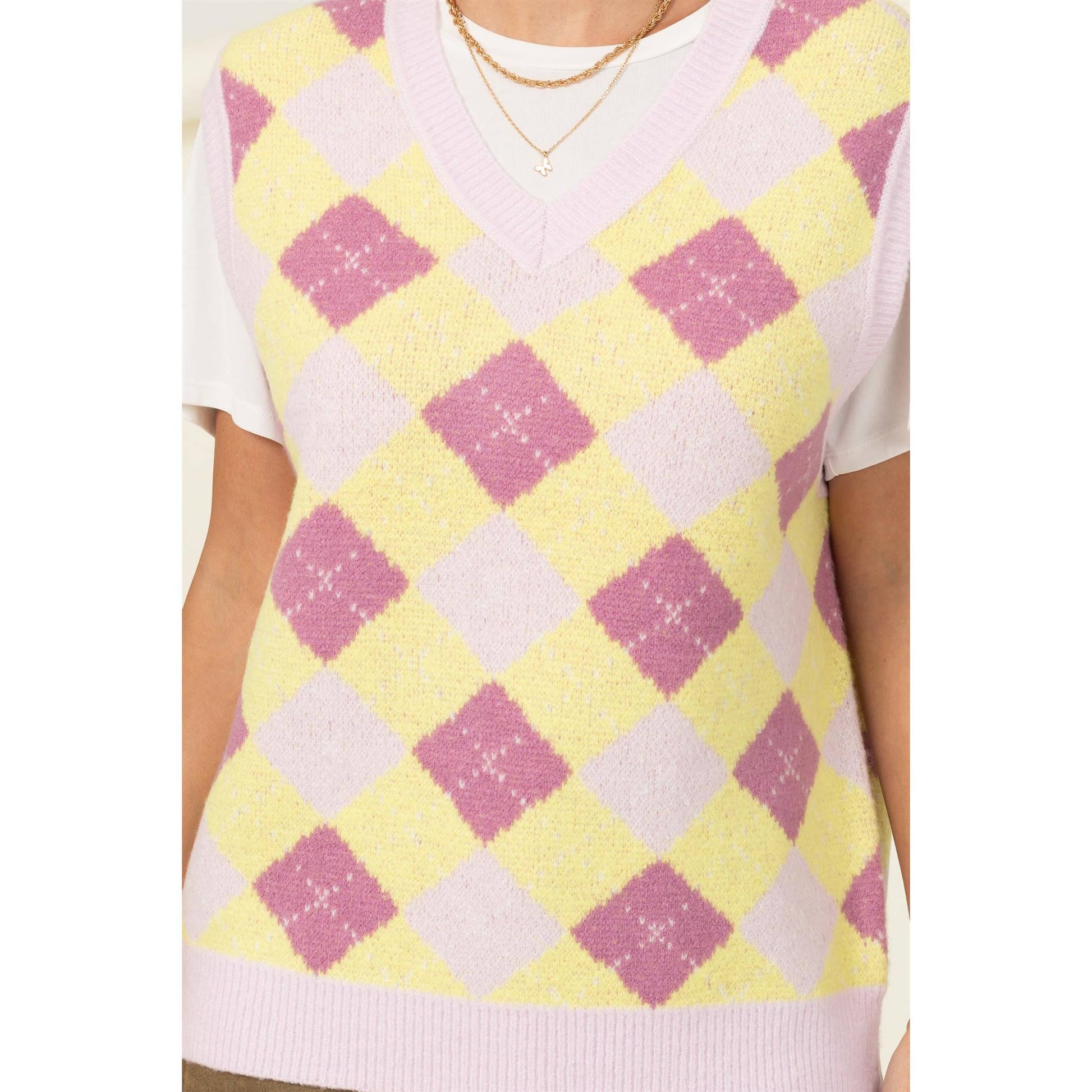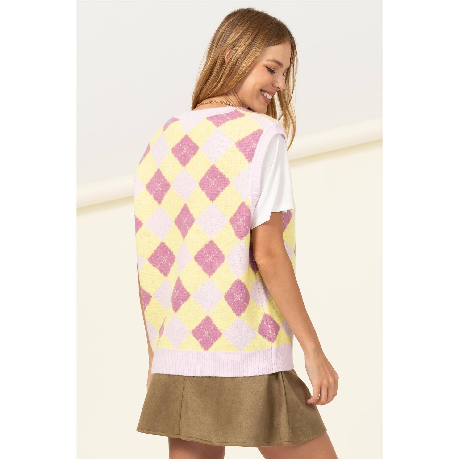 Retro chic is never out of style which is why this vest is all you need to look your best! Fashioned with an all-over argyle print, this lovely piece is tailored with a V-neckline and drop shoulders. Ribbed neck, shoulders and hem finish off the look.