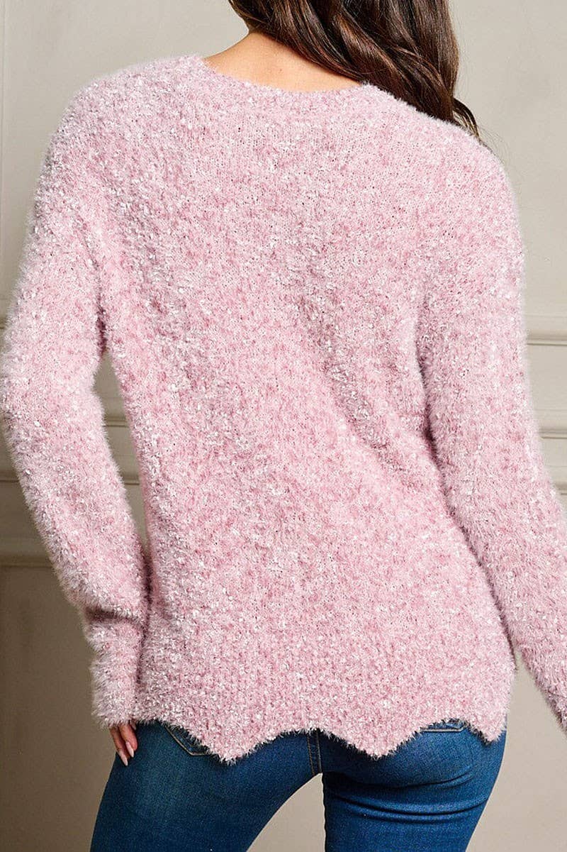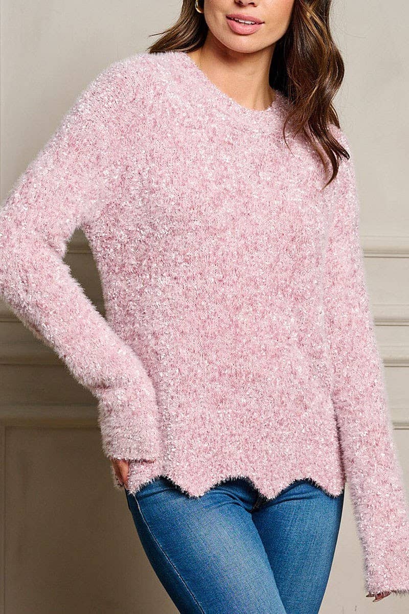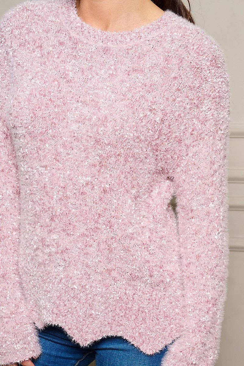 LONG SLEEVE FUZZY PULLOVER SWEATER: Pink