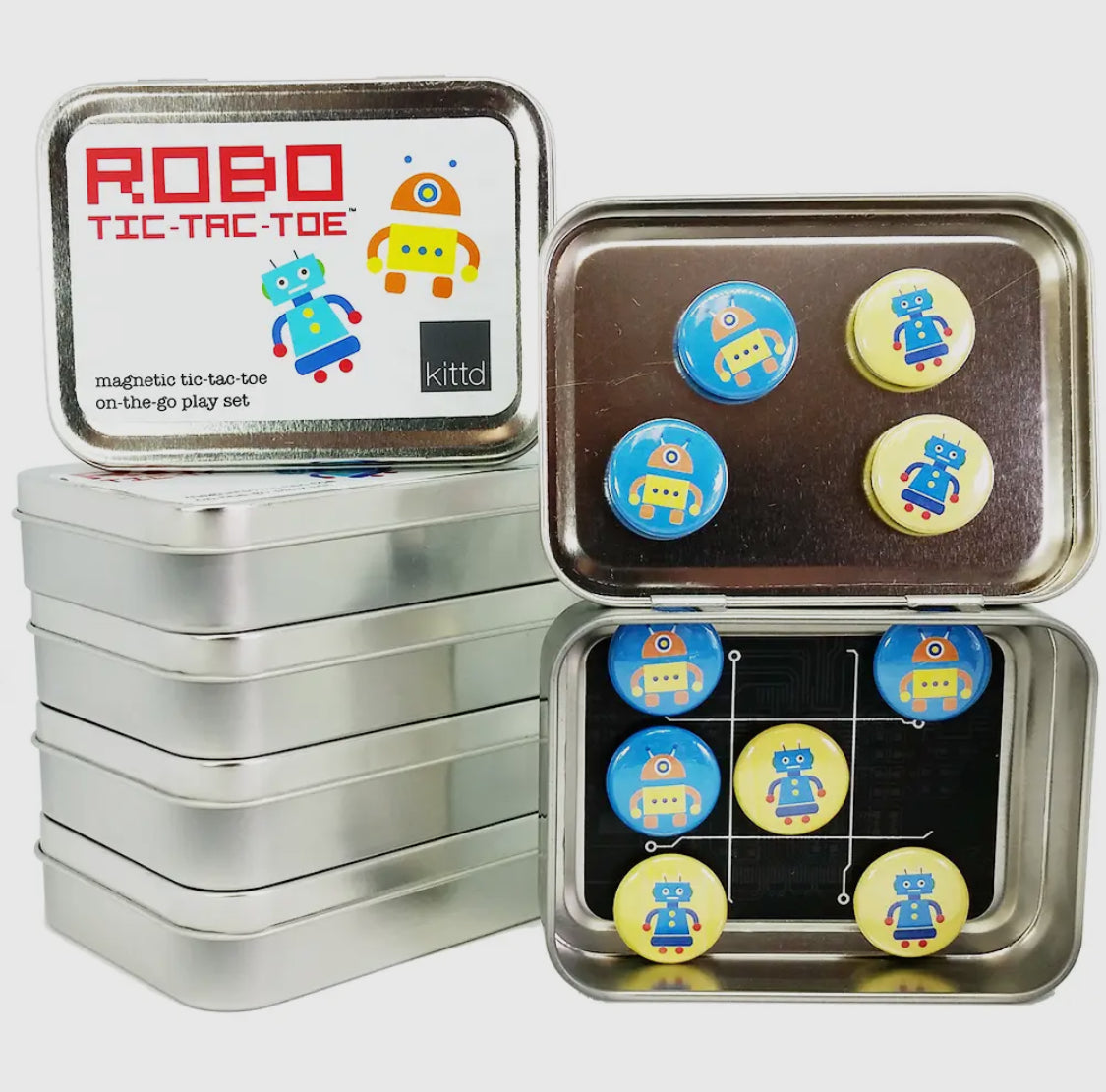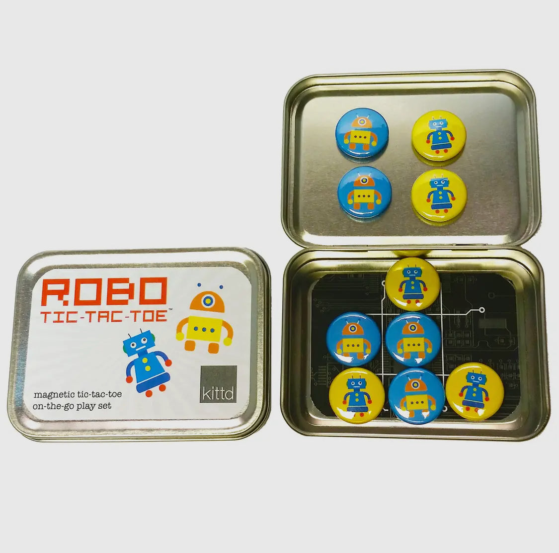 Play tic-tac-toe while you’re on the go with these cute, portable magnetic play sets. Yellow vs. blue robot game pieces are 1” in diameter, with strong ceramic magnets. Tic-tac-toe, a classic game, teaches kids matching, strategy, and turn taking. All pieces fit inside the tin for easy storage & portability in a pocket or purse — play anywhere!