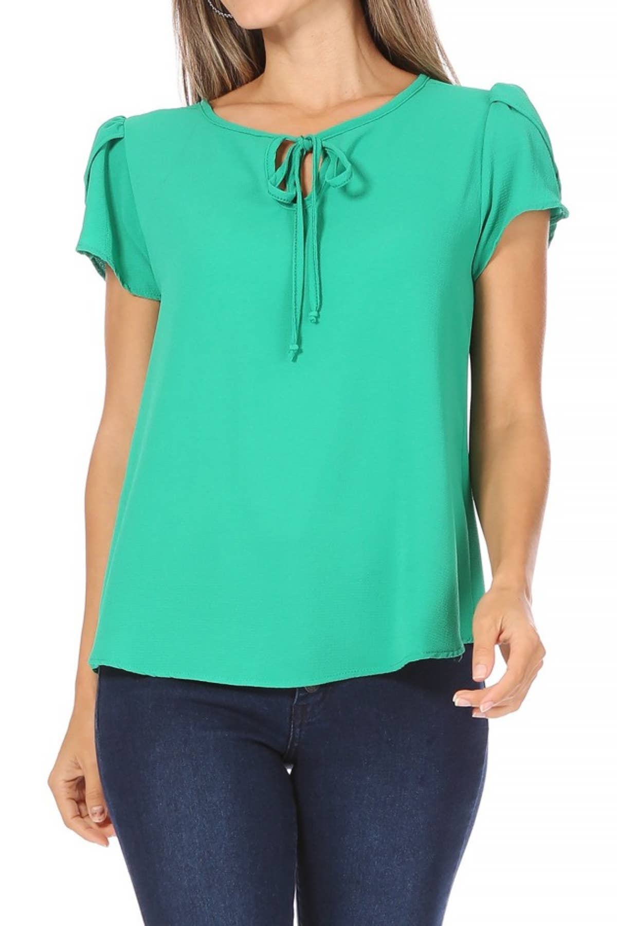 Solid, overlapping short sleeve top with front keyhole and ribbon accent. Perfect choice for your daily wear, outdoor activities, shopping, dates and any other occasions in Spring, Summer, Fall and Winter.
